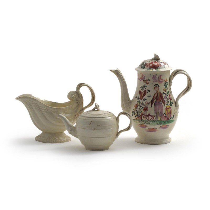 A large creamware coffee pot and cover c.1770-80, brightly painted with a Chinese mother and child in a garden scene, a creamware teapot and cover, moulded with horizontal bands, and a large creamware shell-shaped sauceboat, all with double strap handles issuing from floral motifs, some damages and restoration, 22.5cm max. (5)