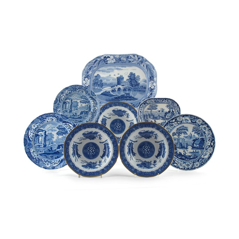 Eight Spode blue and white transferware dishes 19th century, variously decorated with figures before ruins, in riverside landscapes, and with Chinese scrolls and other objects, some with impressed marks. Comprising: an oblong charger, three soup plates, three different plates in two sizes, and a sauce tureen stand. (8)