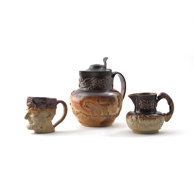 Three brown stoneware jugs 19th century, two decorated with hunting scenes, the larger with a hinged pewter lid, the smallest moulded with the head of Bacchus, 19cm max. (3)