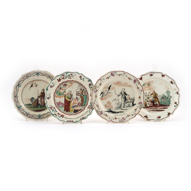 Four creamware plates c.1770-80, Dutch-decorated in polychrome enamels with various scenes of Abraham sacrificing Isaac, one titled 'Abraham Oferhande', two with the biblical reference, the borders with floral or stylized leaf designs, some damages, 25cm. (4)