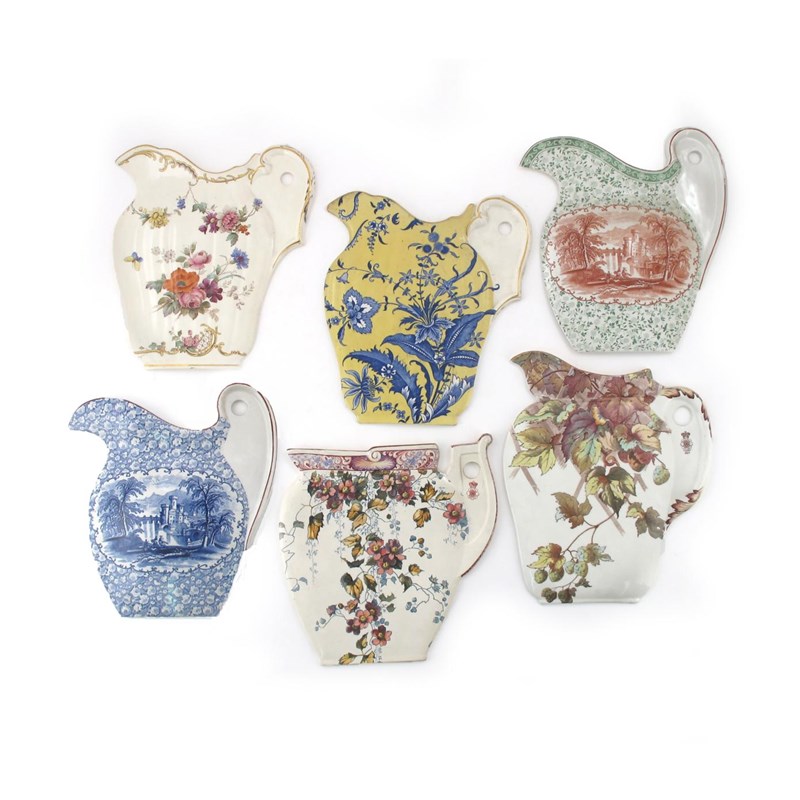 Six English pottery wall-mounted jugs late 19th/early 20th century, two Mogridge and Underhay, printed with a landscape scene reserved on a floral ground, one Minton decorated in the Aesthetic manner with blue flowers on a yellow ground, another Minton with a printed floral pattern, two Doulton Burslem with printed Aesthetic designs, 31cm max. (6)