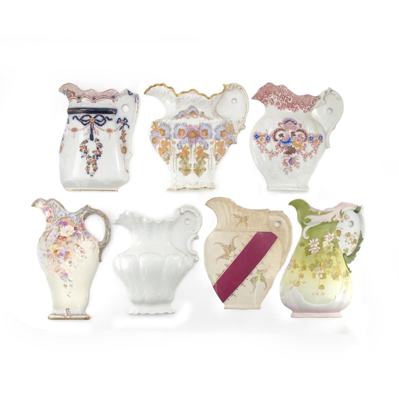 Seven English and Continental pottery wall-mounted jugs 19th and early 20th century, variously moulded and decorated with flowers and foliate scrolls, 34cm max. (7)