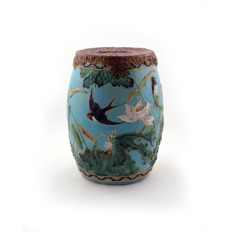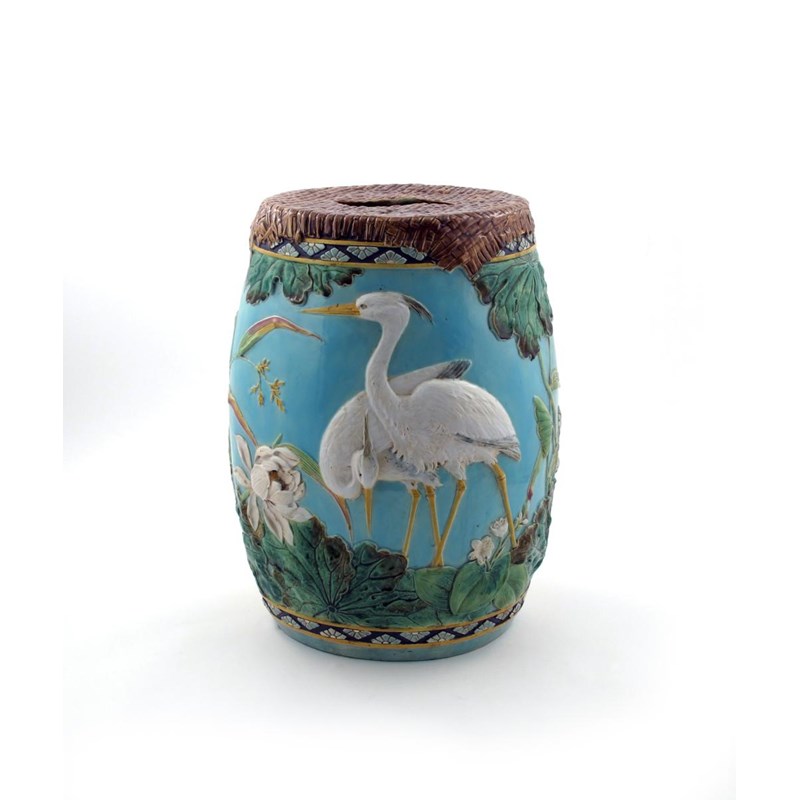 A Majolica garden seat 19th century, the barrel shape applied with cranes standing amidst aquatic plants, the reverse with swallows, all brightly enamelled on a turquoise ground, 48cm high.