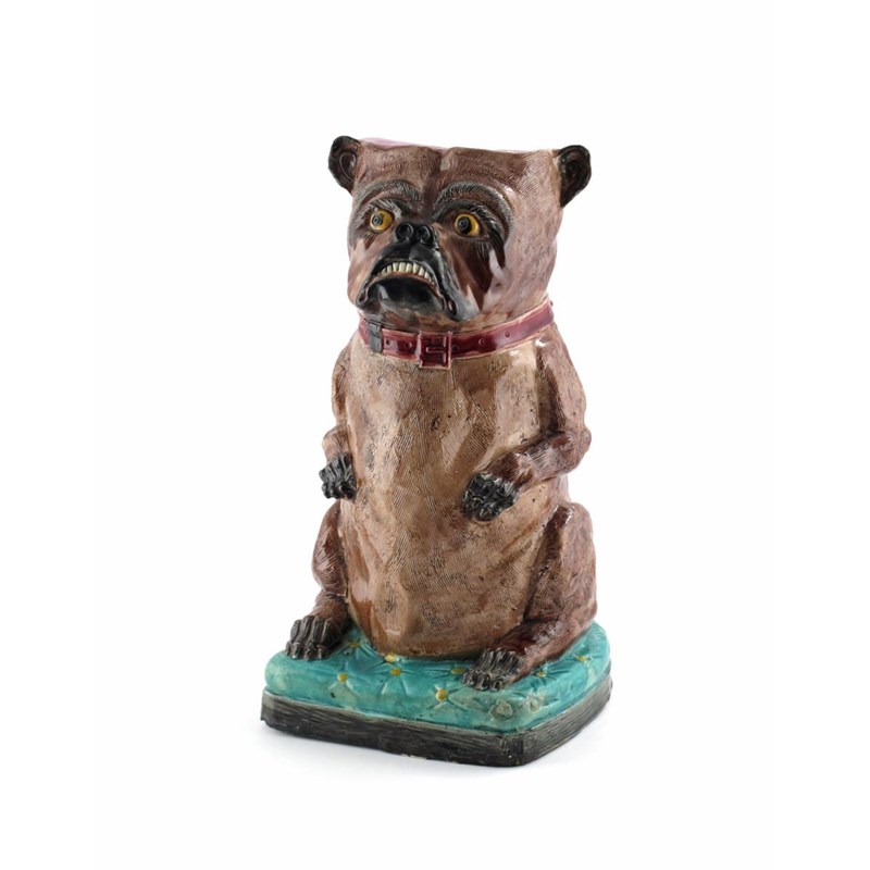 A rare Majolica stick stand 19th century, modelled as a pug dog, seated on its haunches on a green studded cushion and wearing a red collar, the fur finely incised, the interior glazed in pink, 53cm.
