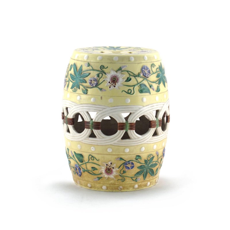 A Minton earthenware garden seat date code for 1876, the reticulated barrel shape moulded and enamelled with bands of Morning Glory and passion flower on a pale yellow ground, impressed marks, 45cm.