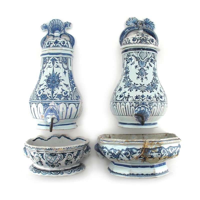 Two French faïence water cisterns and covers with basins 2nd half 18th century, painted with floral swags, scrolls and shell motifs, each fitted with a metal tap to the front, the basins with mask handles, damages and repairs, the cisterns each 50cm high. (6)