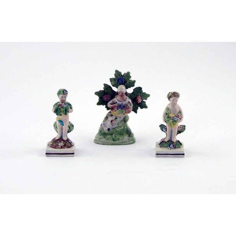Three small pearlware figures early 19th century, two of putti holding baskets of flowers and wearing leafy crowns, the last of a maiden seated with a basket of flowers on her lap before flowering bocage, some restoration to the bocage, 10.5cm max. (3)