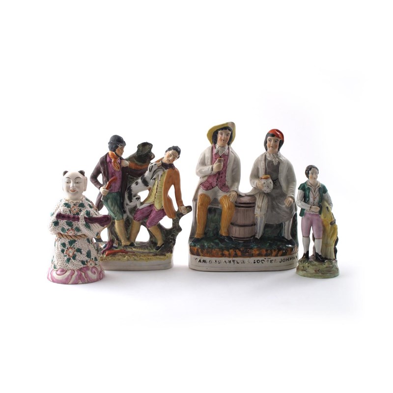 Two Staffordshire figure groups 19th century, one of Tam O'Shanter and Souter Johnny, either side of a barrel of ale, one of William Collier and Thomas Smith at blows, a Staffordshire porcelain figure of a harvester, possibly emblematic of Summer, and a pottery figure of a Japanese monk, some damages, 32cm max. (4)