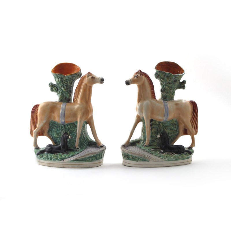 A good pair of Staffordshire spill vases 19th century, each modelled with a red standing horse, a black foal recumbent beneath their withers, beside a stream, 29.5cm. (2)