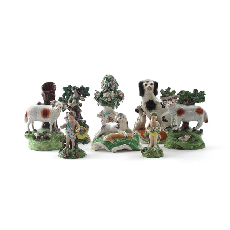 Six Staffordshire pearlware figures 1st half 19th century, two of rams standing before flowering bocage, one a spill vase, two of putti with baskets of flowers, one a girl playing with a cat, the last a seated spaniel with her puppy, a Staffordshire porcelain group of a dog with a dead rabbit, and a Derby flower vase with tall floral arrangement, damages, 15.5cm max. (8)