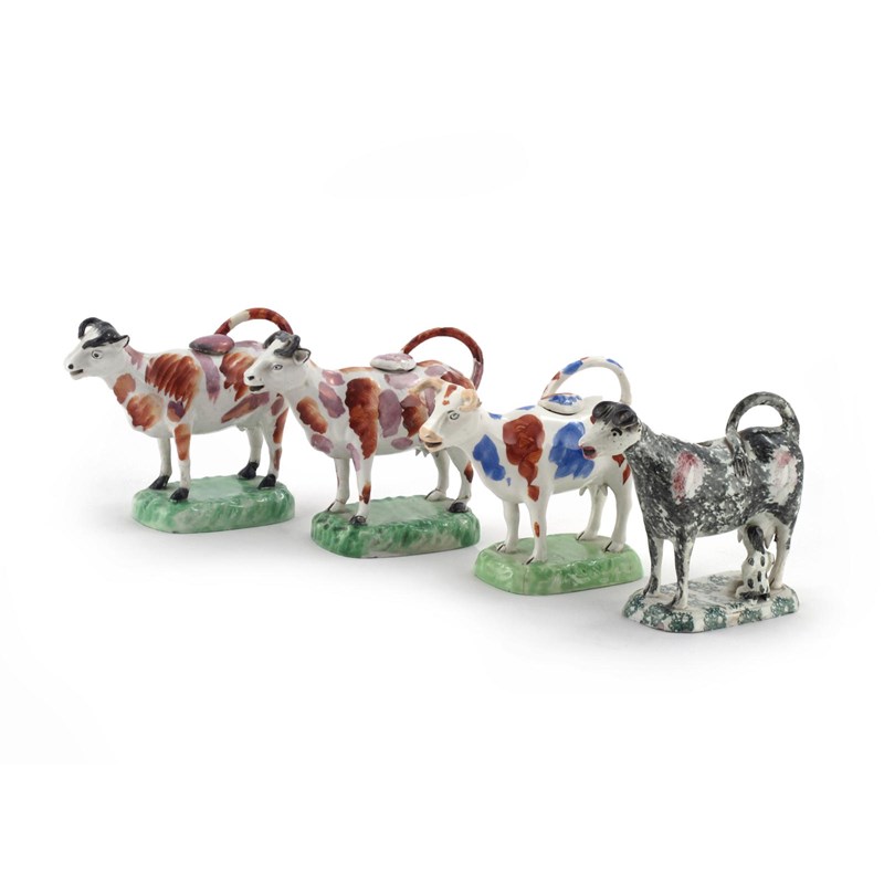 Four cow creamers and three covers early 19th century