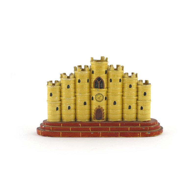A Staffordshire pearlware tulipiere or vase 19th century, modelled as a castle with seven hollow turrets, glazed yellow and raised on a red brick base, red '57' mark beneath, a few chips, 21.2cm across.