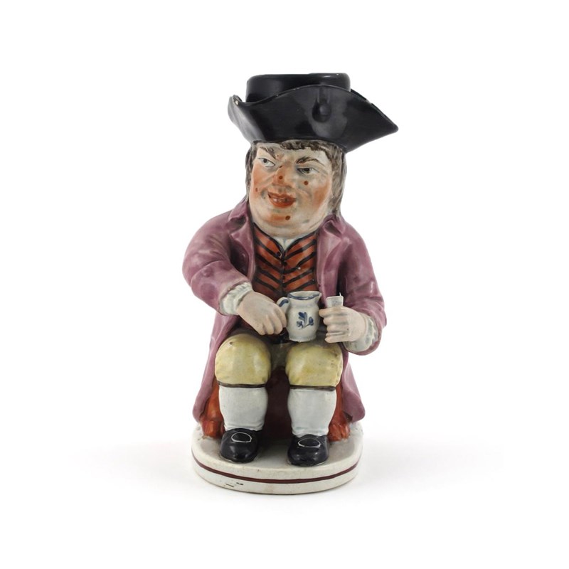 A 'Sinner' toby jug and stopper c.1810-20, seated and with eyes cast askance to his right, holding a small painted jug and a cup, his face of a ruddy and warty complexion, the handle lacking, 20.8cm. (2)