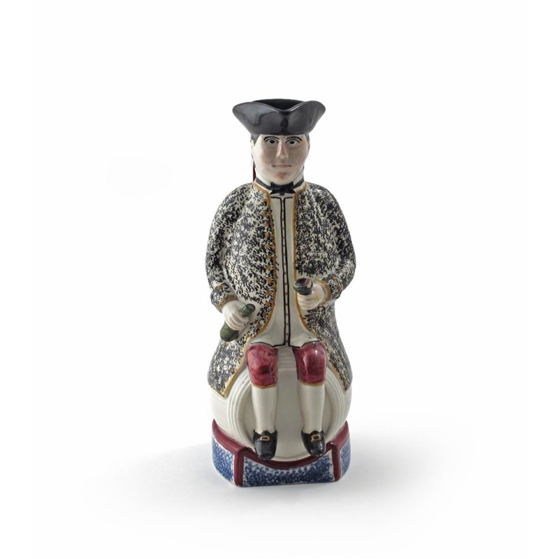 A pearlware Toby jug of Portobello type c.1830, modelled as a gentleman sitting on a barrel and holding a bottle and goblet of wine, decorated in a typical sponged palette, some good restoration to the handle, 26.5cm.