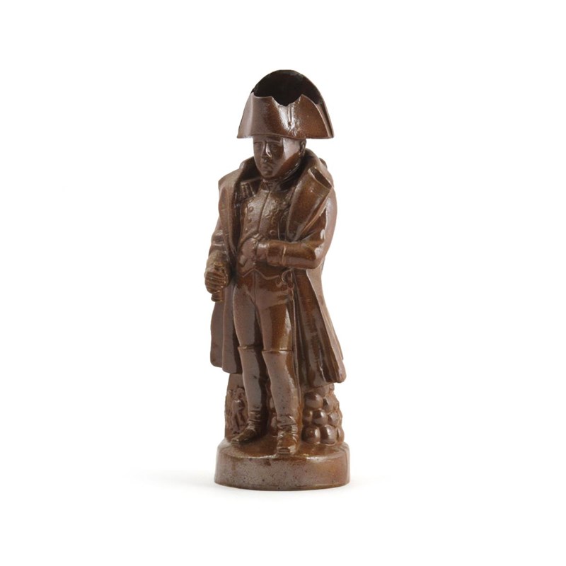 A brown stoneware jug of Napoleon 1st half 19th century, standing beside a pile of cannonballs, his left hand tucked inside his waistcoat, his right holding a short telescope, some damages, 34.5cm.