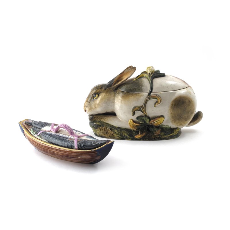 Two Continental Majolica tureens and covers 19th century, one modelled as a large rabbit resting on a grassy base, the other as a boat, the cover formed of two fish laid end to end and tied with pink ribbon, unmarked, one ear of the rabbit broken and restuck, 40cm max. (4)