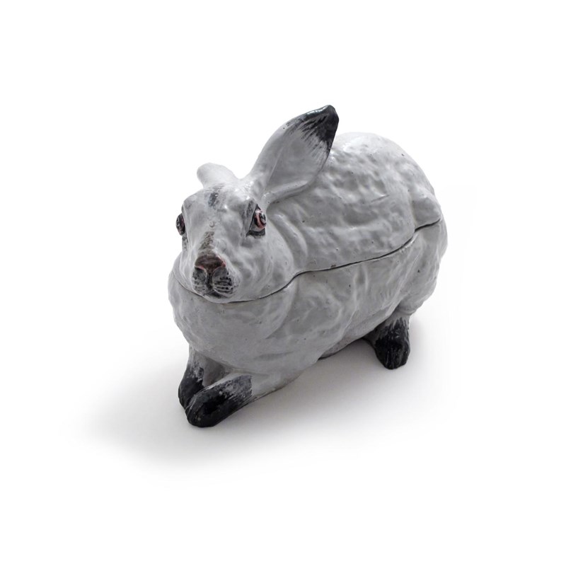 A Continental tin-glazed rabbit tureen and cover 19th century, of large size, the rabbit recumbent with ears back, glazed in white and highlighted in grey and pink, 42cm across. (2)