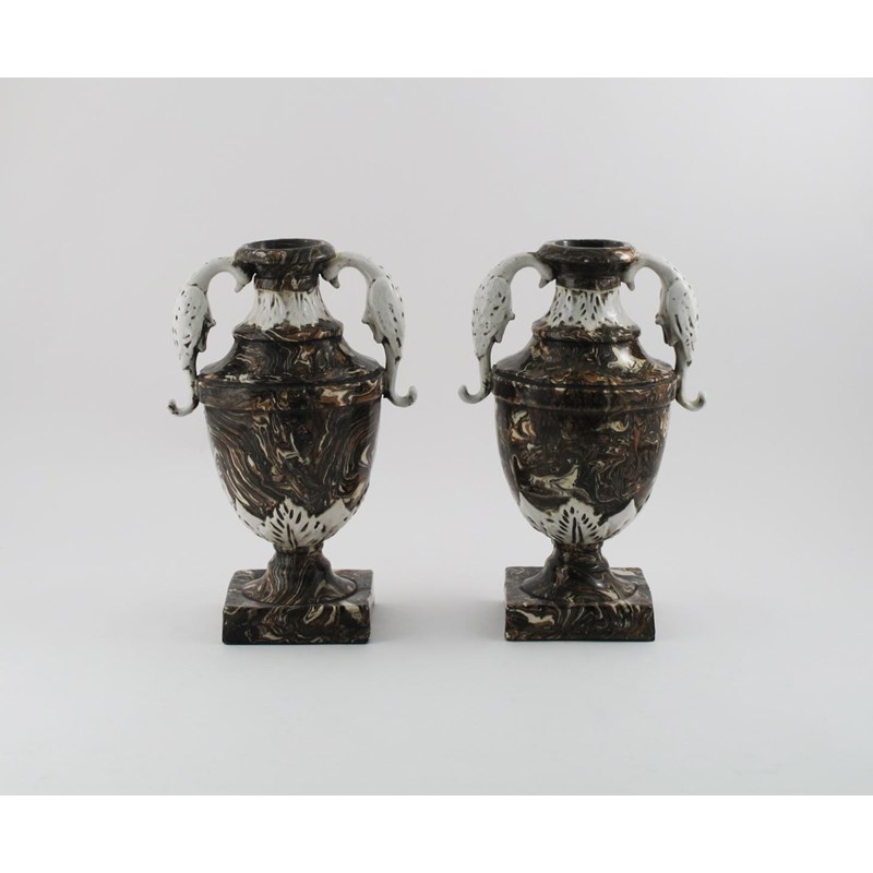 A large pair of Continental agateware vases 19th century, the urn-shaped bodies marbled in cream, brown and black, the handles formed as peacocks, 36.5cm. (2)
