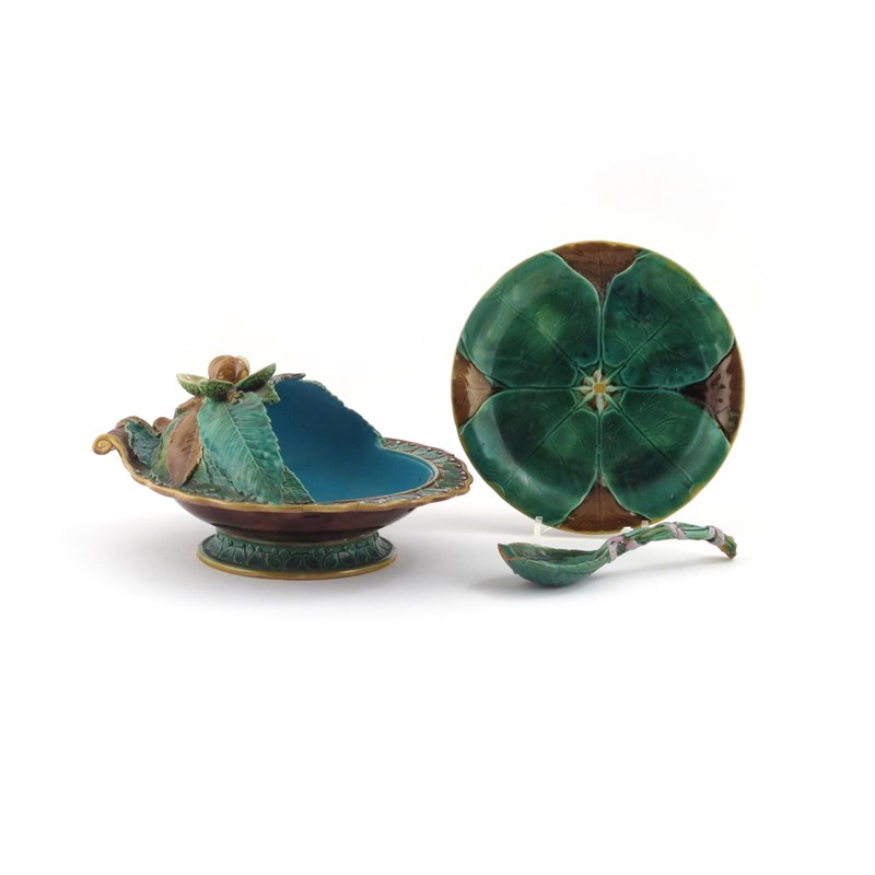 A Minton Majolica chestnut dish and spoon date code for 1881, the circular form raised on a low foot and partially covered by overlapping leaves, the spoon formed of leaves tied with pink ribbon, and a Continental Majolica plate with a lotus leaf design, impressed marks to the dish, damages, 28cm max. (3)