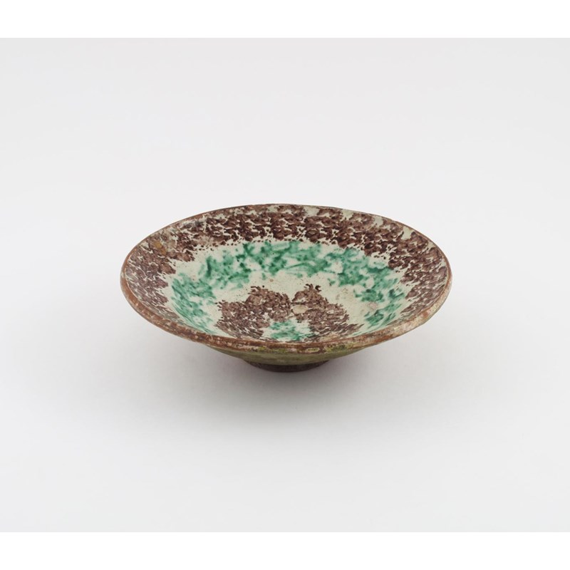 A tin-glazed pottery bowl probably Spanish 18th/19th century, with sponged bands of green and manganese on a cream ground, raised on a low foot, some glaze chips, 25.8cm.