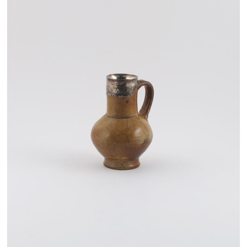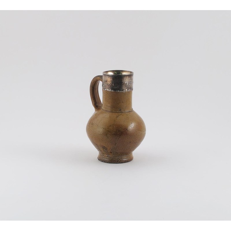A Frechen stoneware silver-mounted jug 16th century, the globular body with a pale glaze of tigerware type, the wide silver rim with a chased foliate design, impressed D mark, broken and repaired, 18.5cm.