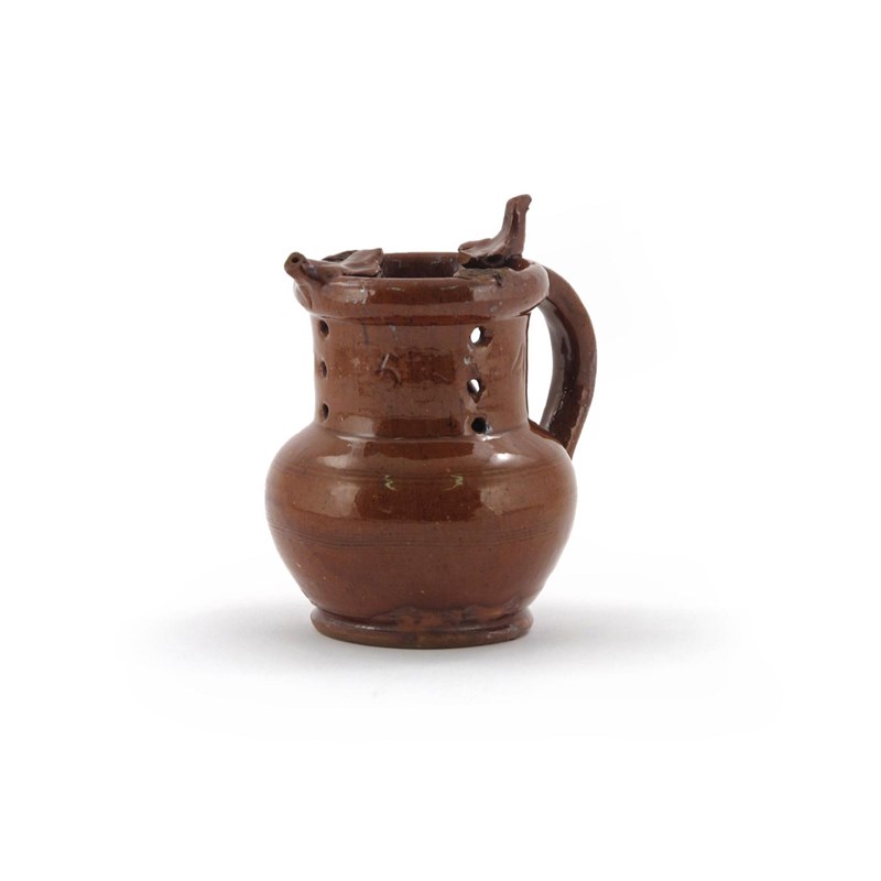 A dated English slipware puzzle jug c.1754, possibly Sussex, the squat body decorated in a treacle glaze, the neck pierced with holes and a large heart beneath the handle, the rim applied with birds, incised '1754', damages to the birds, 16cm.