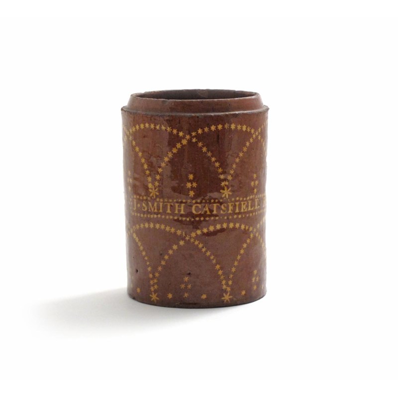 A Sussex pottery leadglaze tobacco jar dated 23rd February 1811, the cylindrical body decorated in a treacle glaze with yellow star garlands, inscribed 'J. Smith Catsfield Feb*23*1811', the cover lacking, 16.7cm.