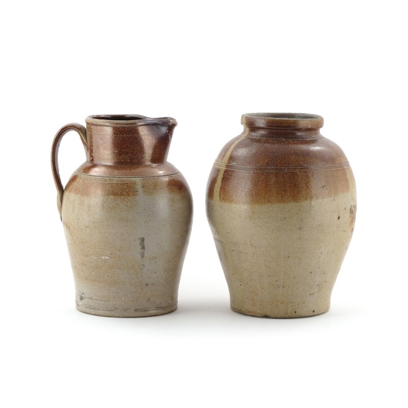 A large brown stoneware jar mid 18th century, probably Fulham, the ovoid shape with an incised band to the shoulder and a graduated brown glaze, and a similar large stoneware jug with strap handle, 31cm. (2)