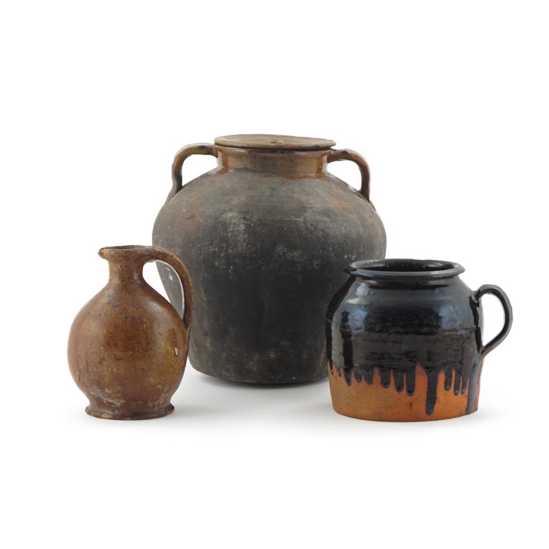 A large earthenware two-handled jar and cover 18th/19th century, covered to the interior with a treacle-coloured lead glaze, a small country pottery jug, 17th/18th century, decorated in a warm brown glaze, and a 19th century single-handled jar glazed to the interior and the upper exterior in black-brown, 28cm max. (4)