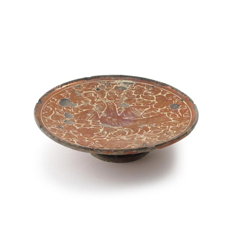 A Hispano-Moresque tazza 17th century, decorated in a rich copper lustre with a central bird within dense foliage, raised on a low foot, some glaze losses, 23.5cm dia.
