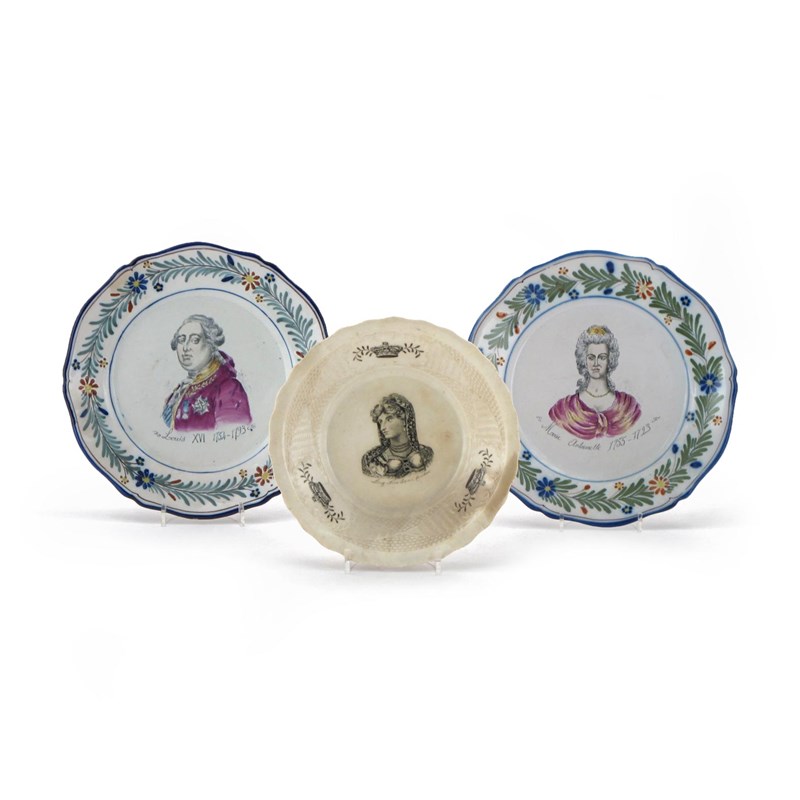 A pair of faïence commemorative plates 19th century, painted with titled portraits of Louis XVI and Marie Antoinette within stylized floral borders, and a pearlware plate with moulded border, printed in black with a portrait of Queen Caroline, 13.7cm max. (3)