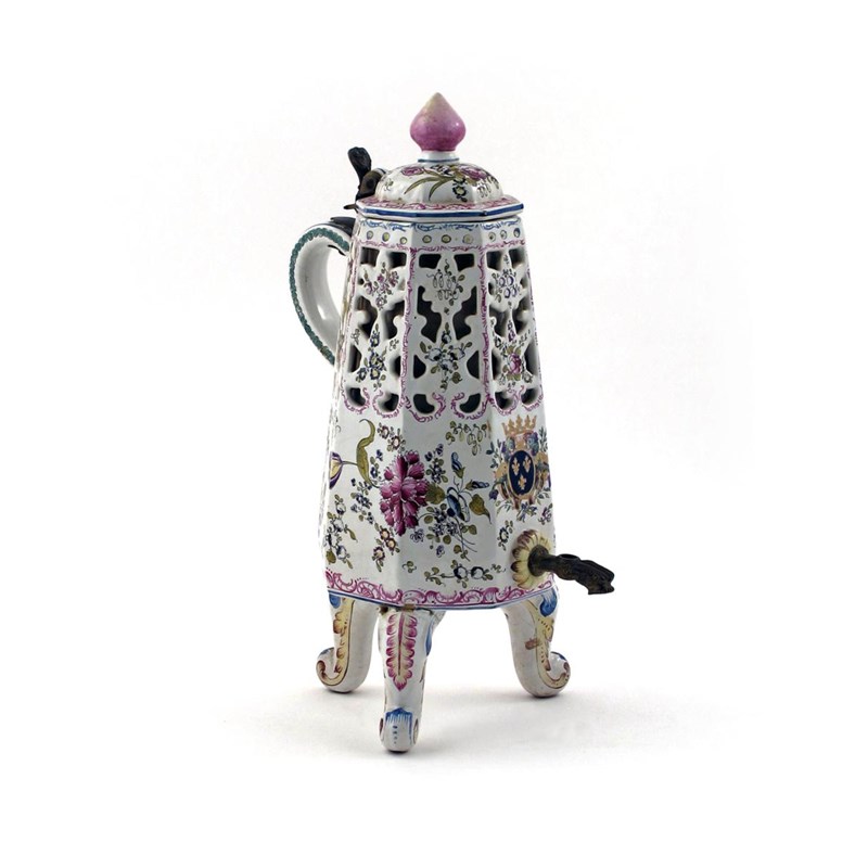 A Continental faïence water urn 19th century, decorated in the Strasbourg manner with a triple fleur de lys shield beneath crowned dolphins, within simple flowers, the upper part of the double-walled body pierced with a geometric design, with a hinged lid, the whole raised on three feet, some damages, 38cm.