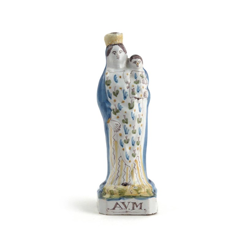 A Continental faïence figure of the Madonna and child 18th/19th century, standing, wearing a floral robe beneath a blue cloak, raised on a square base titled 'A.V.M.', 23cm.