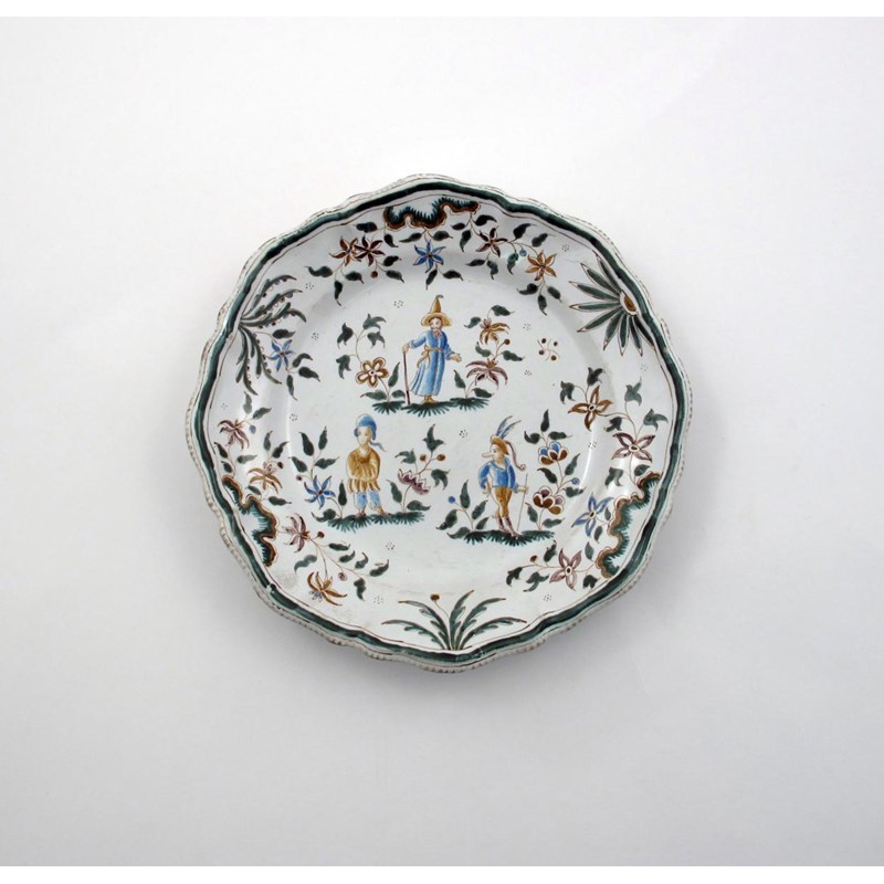 A Moustiers faïence plate mid 18th century, painted in shades of green, ochre, blue and manganese with grotesque figures and floral sprays, within a shaped rim, FC mark to the reverse, 26cm.