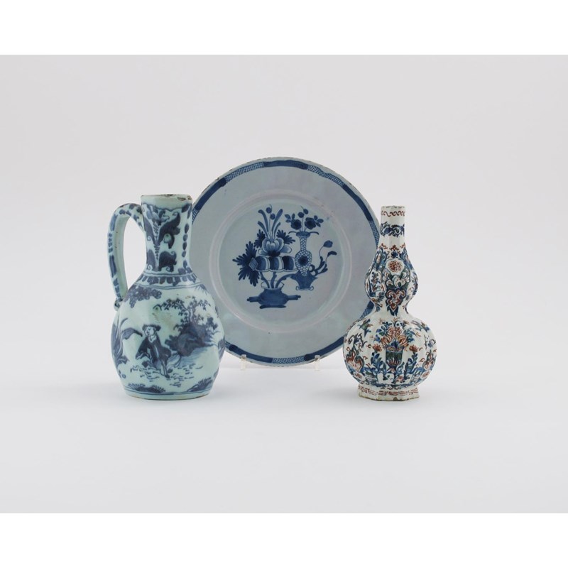 A Delft lobed vase c.1730-40, of double gourd shape, painted in red, green and blue with birds in flight above vases of flowers, a spiral-moulded jug painted in blue with Chinese figures in a landscape, and a plate decorated with vases of flowers, some glaze chipping, 22.2cm max. (3)