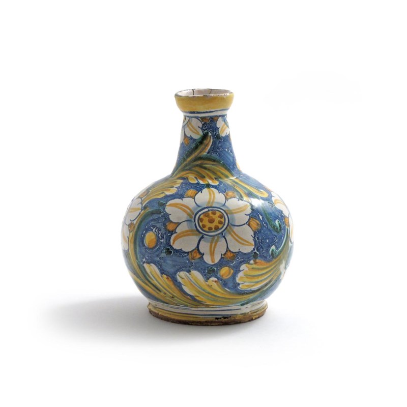 An Italian maiolica bottle Siciliy c.1700, painted with a continuous design of large flowerheads in shades of yellow, ochre and green on a blue ground, drilled, a section of the rim broken and restuck, 22cm.