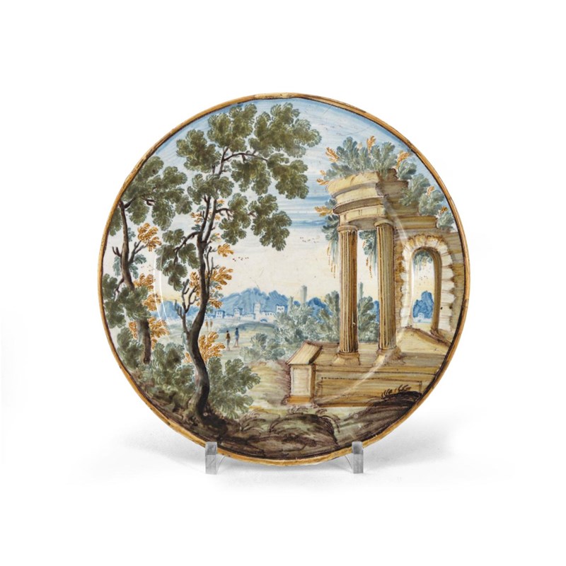 A small Castelli maiolica plate mid 18th century, painted with distant figures before a turreted bridge, with overgrown Classical ruins and tall trees to the foreground, 18.2cm.
