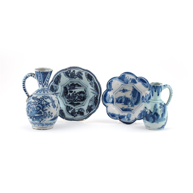 Two small Delft lobed dishes late 17th/18th century, each painted with a seated Chinese figure to the well, a small jug painted with two figures seated beside rockwork, and a larger tin-glazed jug painted with flying insects, flowers and foliage, some chipping, 22.5cm max. (4)