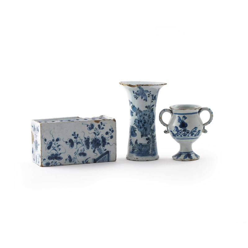 A delftware flowerbrick c.1750-60, painted in blue with peony issuing from a fence, a flared Delft vase with similar decoration and a two-handled small vase with stylized flowers and rockwork, damages, 16.5cm max. (3)