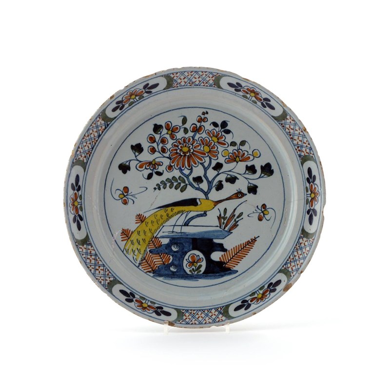 A large delftware polychrome plate 2nd half 18th century, brightly decorated with a peacock perched on a slab before a flowering tree, the rim with flowerhead motifs between diaper panels, broken and repaired, 33.5cm.