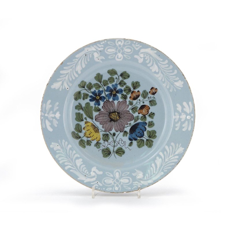 A Bristol delftware plate c.1760-70, the well decorated in the Fazackerly palette with a tied arrangement of flowers, the rim with stylized flowers and leaf fronds in bianco-sopra-bianco, 23cm.