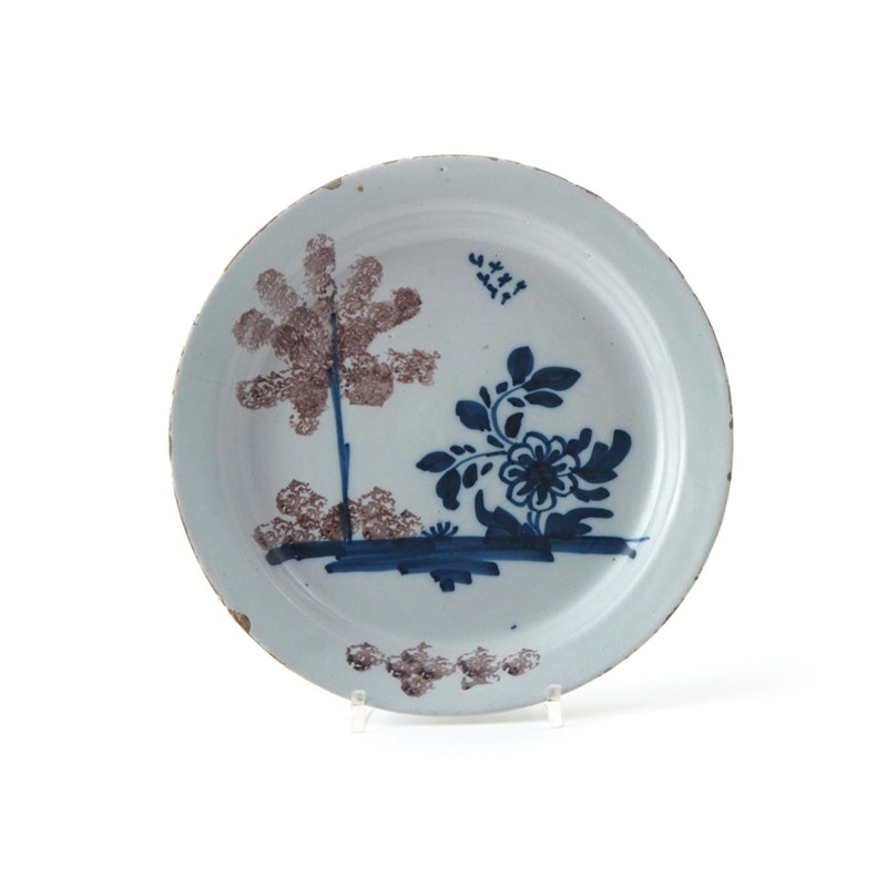 A Bristol delftware plate c.1740, decorated with a small flock of birds in flight above a manganese sponged tree and a large blue flower, some good restoration to the rim, 22cm.