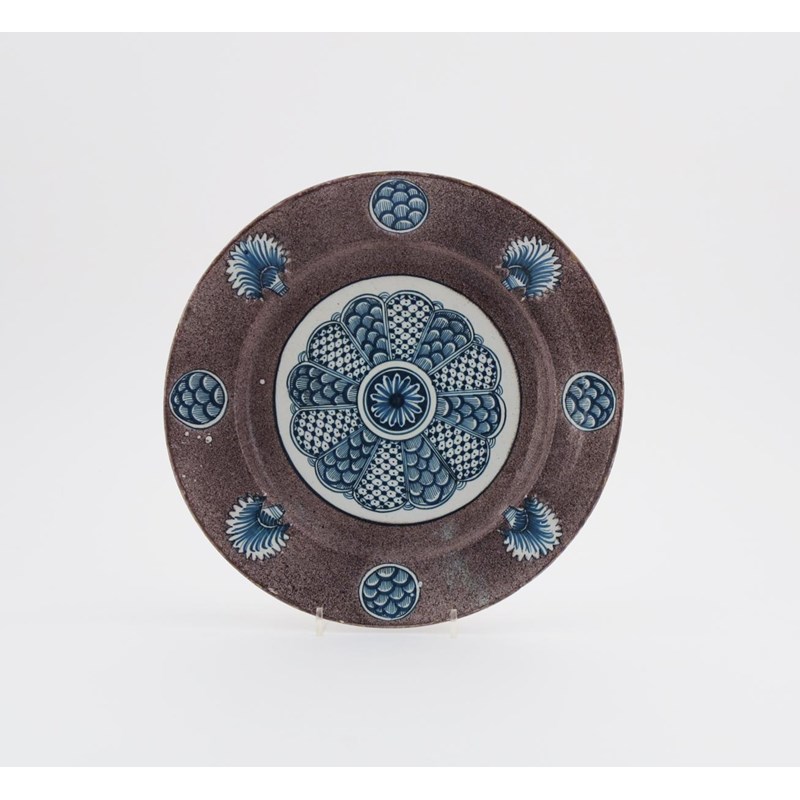 A good delftware charger c.1748, Bristol or Wincanton, painted in blue with a central stylized flowerhead within a wide powdered manganese border, the rim with blue scale panels and carnation heads, 32.7cm.