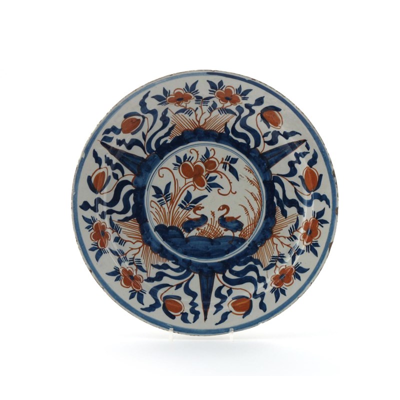 A large Delft plate 18th century, painted in red and blue with two swans to the well, within a wide border of flowers and leaves, red 5 to the reverse, 34.3cm.