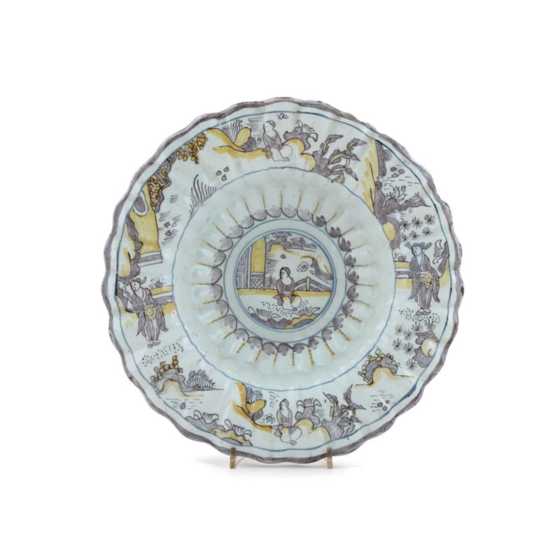 A large Delft lobed dish late 17th/early 18th century, decorated in manganese, yellow and blue with a central seated Chinese figure, the rim with further figures in garden settings, blue mark to the reverse, 34.5cm.