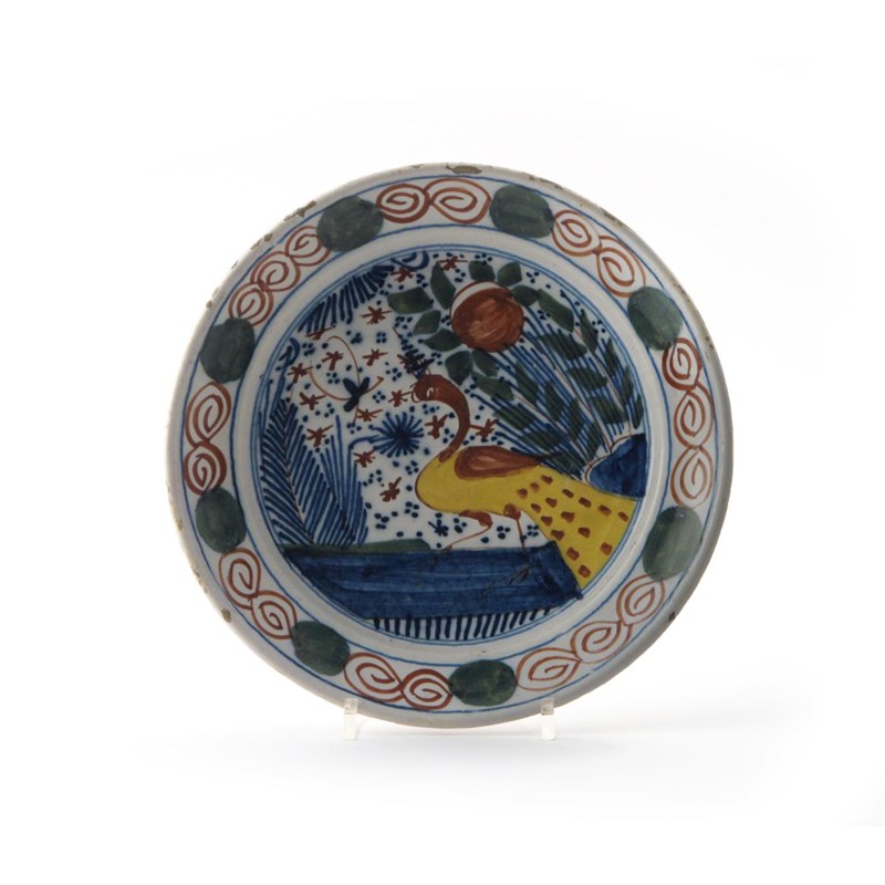 A Delft polychrome plate 1st half 18th century, brightly decorated with a peacock and a flying insect, the rim with a continuous band of red swirls and large green dots, 22cm.