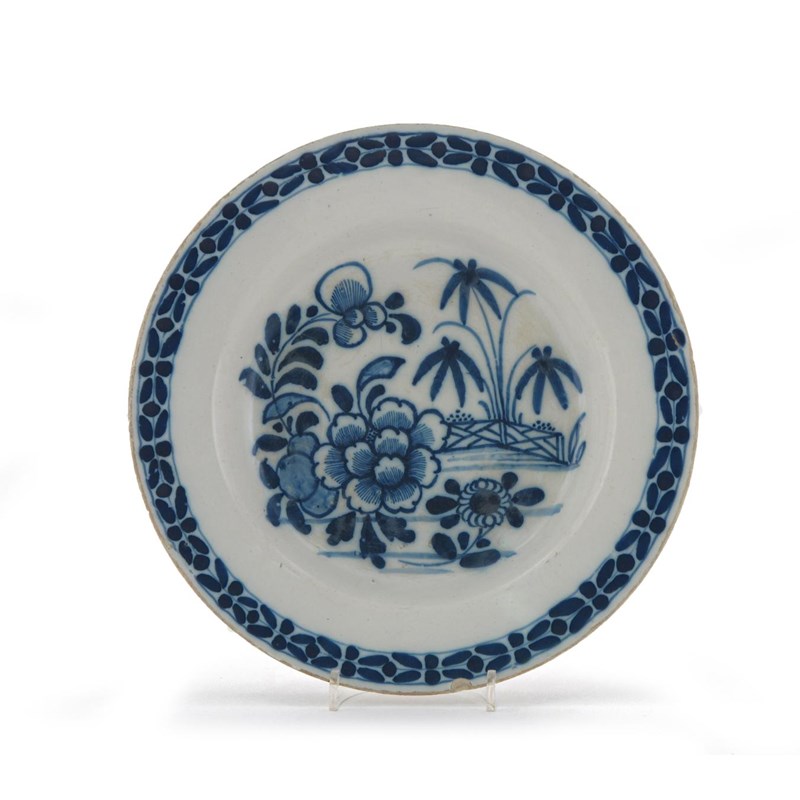 A rare Dublin delftware plate mid 18th century, painted in blue with the Bamboo Fence pattern, a large peony before bamboo issuing from behind a fence, painted 7 mark to the reverse, 24cm.