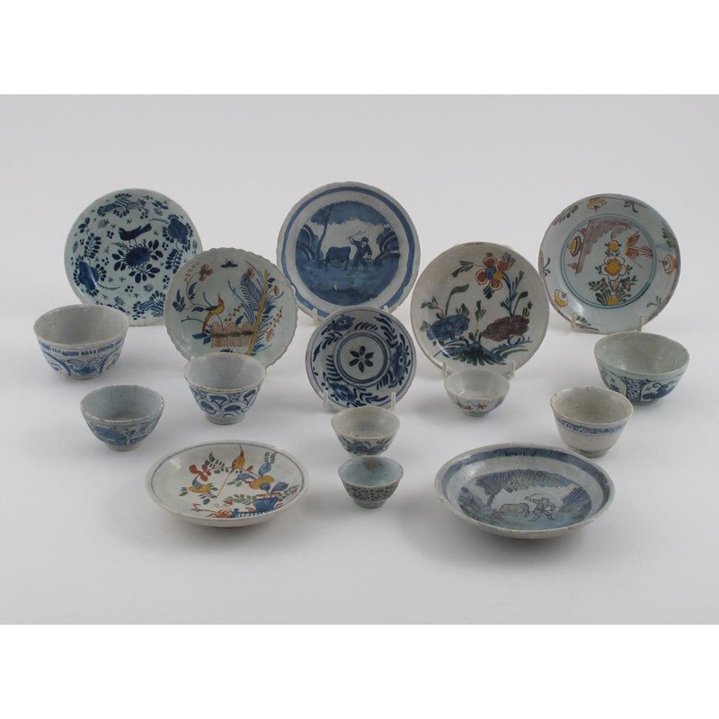 Eight Delft teabowls and eight Delft saucers most 18th century, variously decorated in blue and polychrome with flowers, birds and the Boy with Buffalo pattern, damages, 12.7cm max. (16)