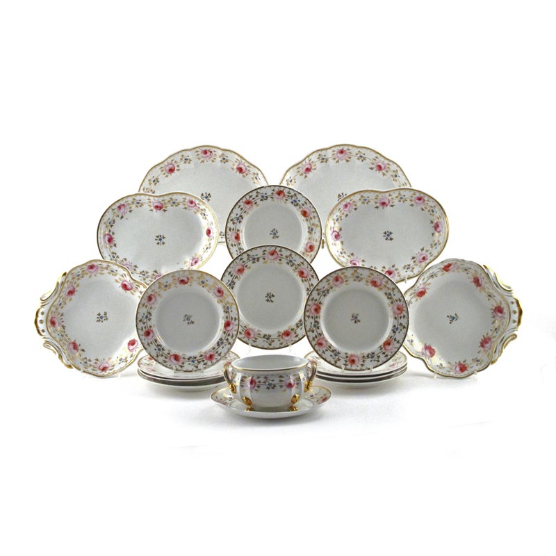 A Bloor Derby part dessert service c.1830, painted with a pattern of pink roses and small blue flowers with gilt leaves, iron red circular marks. Comprising: an oval bowl and stand, two oval dishes, two shell-shaped dishes, two kidney dishes, and 10 plates. (18)