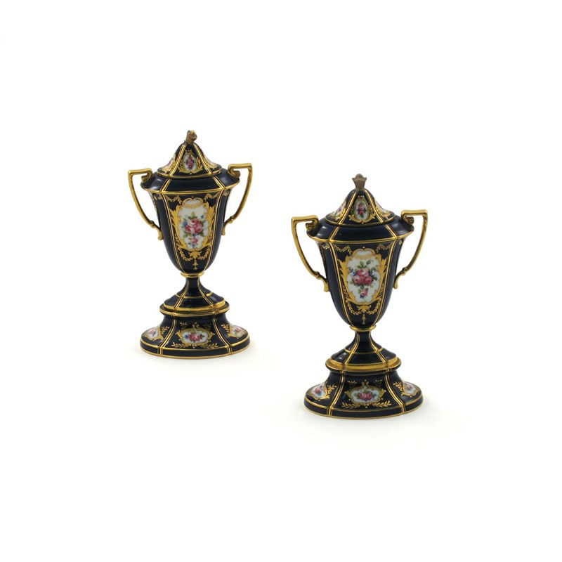 A pair of Minton vases and covers early 20th century, the flattened quatrefoil forms painted with panels of pink roses reserved on a dark blue ground, printed marks, some damage to the covers, 19.5cm. (4)